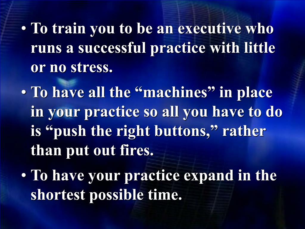 To train you to be an executive who runs a successful practice with little or no stress. • To have all the “machines” in place in your practice so all you have to do is “push the right buttons,” rather than put out fires. • To have your practice expand in the shortest possible time.