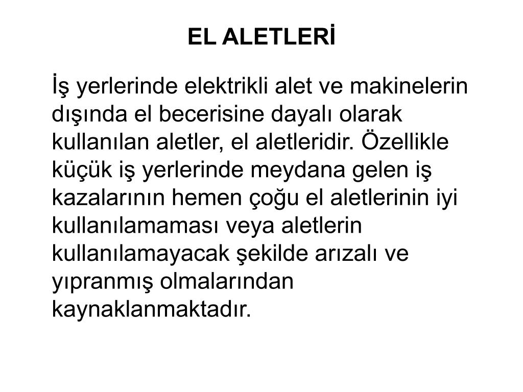 EL ALETLERİ İş yerlerinde elektrikli alet ve makinelerin dışında el becerisine dayalı olarak kullanılan aletler, el aletleridir. Özellikle küçük iş yerlerinde meydana gelen iş kazalarının hemen çoğu el aletlerinin iyi kullanılamaması veya aletlerin kullanılamayacak şekilde arızalı ve yıpranmış olmalarından kaynaklanmaktadır.