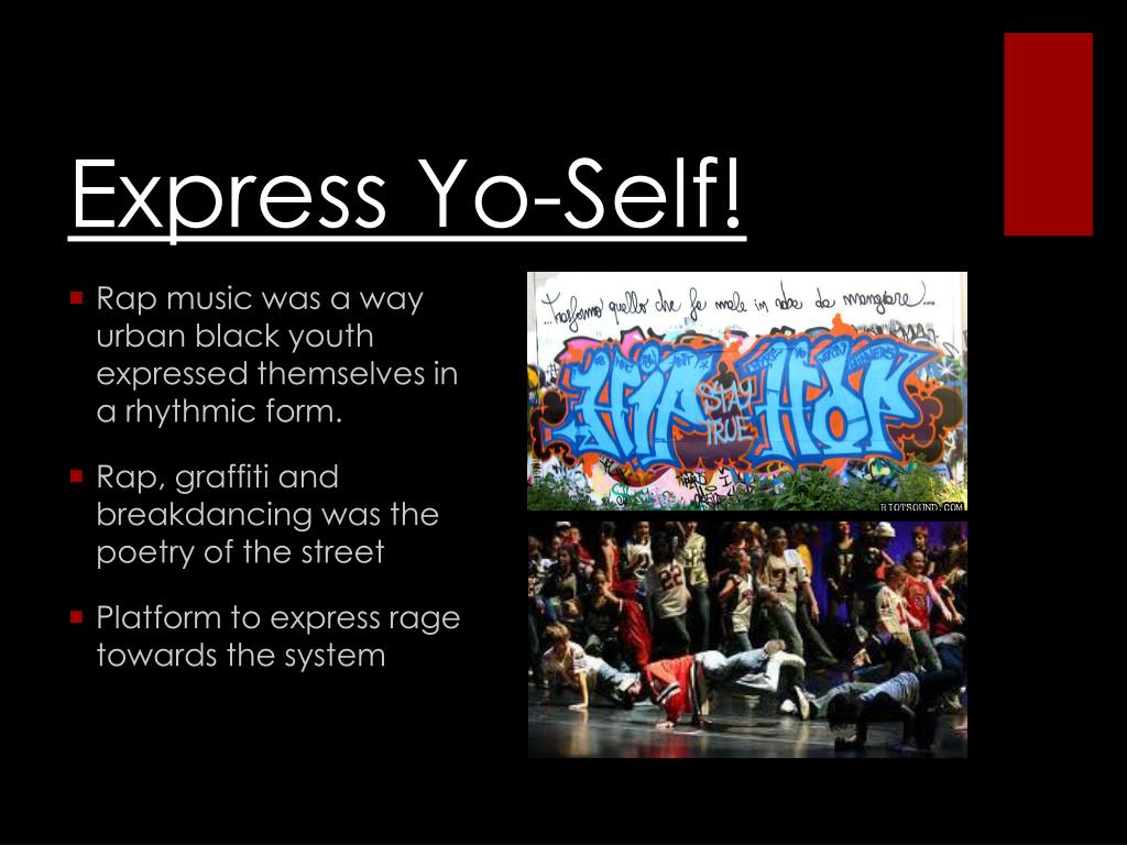 Express Yo-Self! • Rap music was a way urban black youth expressed themselves in a rhythmic form. • Rap, graffiti and breakdancing was the poetry of the street • Platform to express rage towards the system