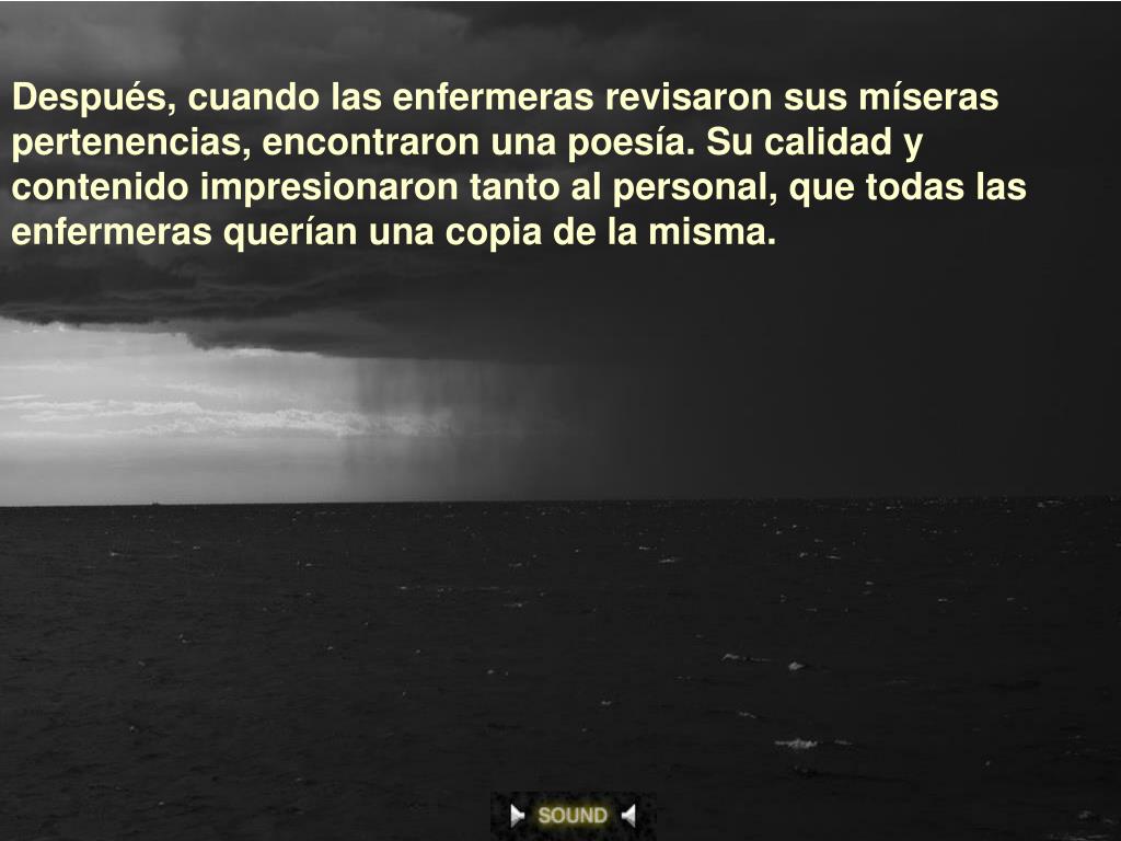Después, cuando las enfermeras revisaron sus míseras pertenencias, encontraron una poesía. Su calidad y contenido impresionaron tanto al personal, que todas las enfermeras querían una copia de la misma.