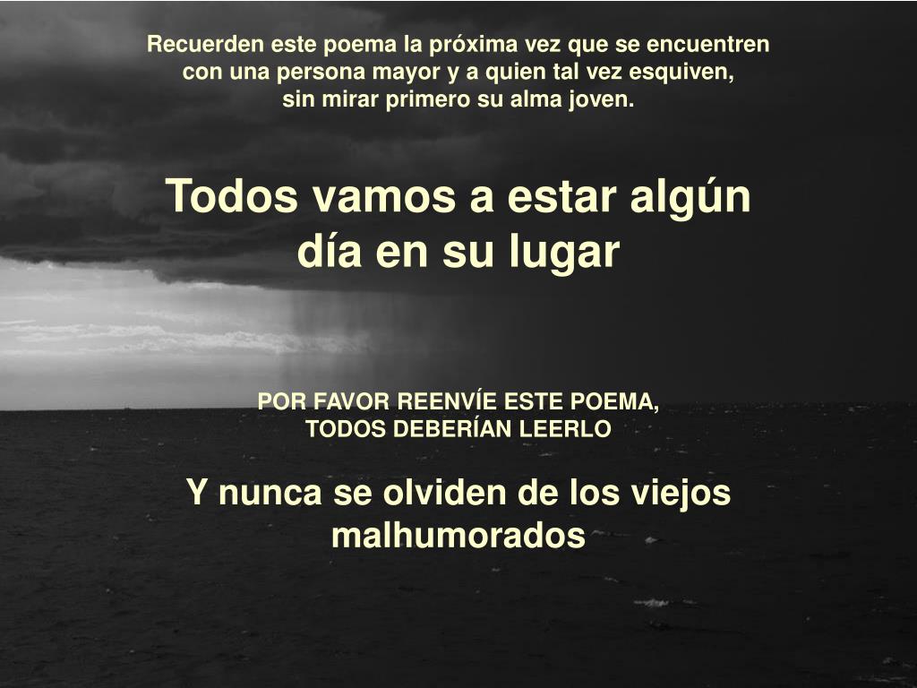 Recuerden este poema la próxima vez que se encuentren con una persona mayor y a quien tal vez esquiven, sin mirar primero su alma joven. Todos vamos a estar algún día en su lugar POR FAVOR REENVÍE ESTE POEMA, TODOS DEBERÍAN LEERLO Y nunca se olviden de los viejos malhumorados