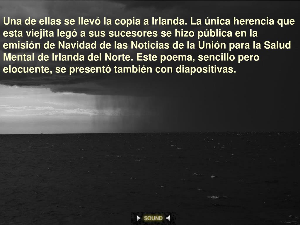 Una de ellas se llevó la copia a Irlanda. La única herencia que esta viejita legó a sus sucesores se hizo pública en la emisión de Navidad de las Noticias de la Unión para la Salud Mental de Irlanda del Norte. Este poema, sencillo pero elocuente, se presentó también con diapositivas.