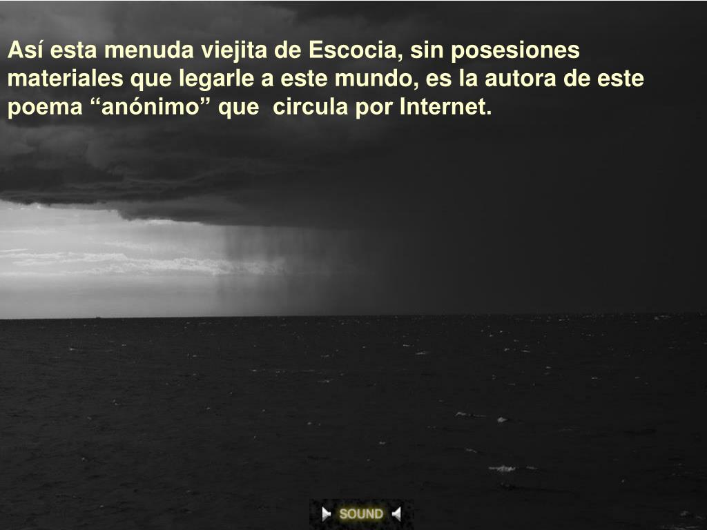 Así esta menuda viejita de Escocia, sin posesiones materiales que legarle a este mundo, es la autora de este poema “anónimo” que circula por Internet.