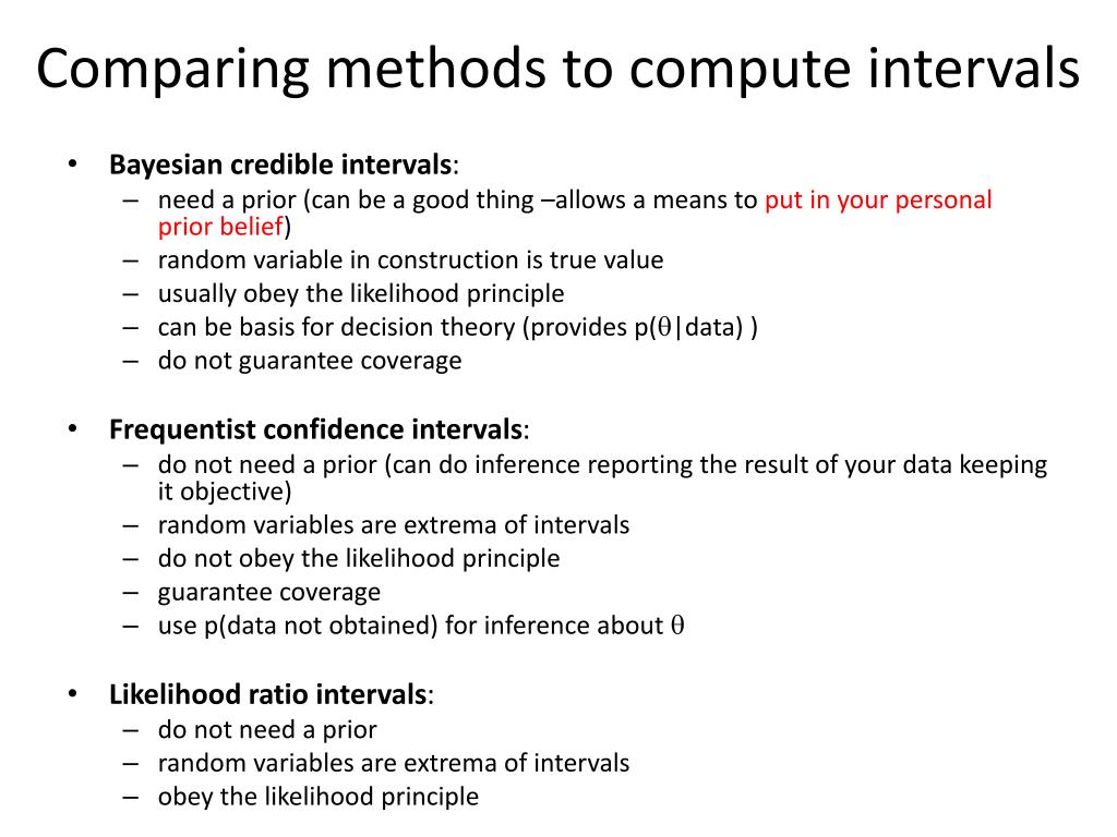 Comparing methods to compute intervals • Bayesian credible intervals: • need a prior (can be a good thing –allows a means to put in your personal prior belief) • random variable in construction is true value • usually obey the likelihood principle • can be basis for decision theory (provides p(q|data) ) • do not guarantee coverage • Frequentist confidence intervals: • do not need a prior (can do inference reporting the result of your data keeping it objective) • random variables are extrema of intervals • do not obey the likelihood principle • guarantee coverage • use p(data not obtained) for inference about q • Likelihood ratio intervals: • do not need a prior • random variables are extrema of intervals • obey the likelihood principle