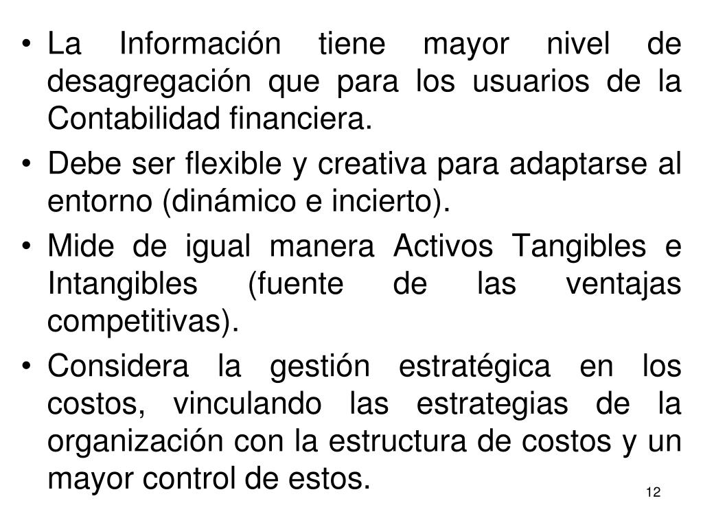 La Información tiene mayor nivel de desagregación que para los usuarios de la Contabilidad financiera. • Debe ser flexible y creativa para adaptarse al entorno (dinámico e incierto). • Mide de igual manera Activos Tangibles e Intangibles (fuente de las ventajas competitivas). • Considera la gestión estratégica en los costos, vinculando las estrategias de la organización con la estructura de costos y un mayor control de estos.