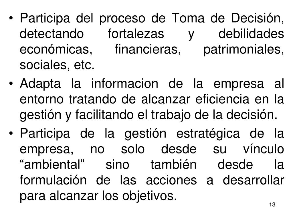 Participa del proceso de Toma de Decisión, detectando fortalezas y debilidades económicas, financieras, patrimoniales, sociales, etc. • Adapta la informacion de la empresa al entorno tratando de alcanzar eficiencia en la gestión y facilitando el trabajo de la decisión. • Participa de la gestión estratégica de la empresa, no solo desde su vínculo “ambiental” sino también desde la formulación de las acciones a desarrollar para alcanzar los objetivos.
