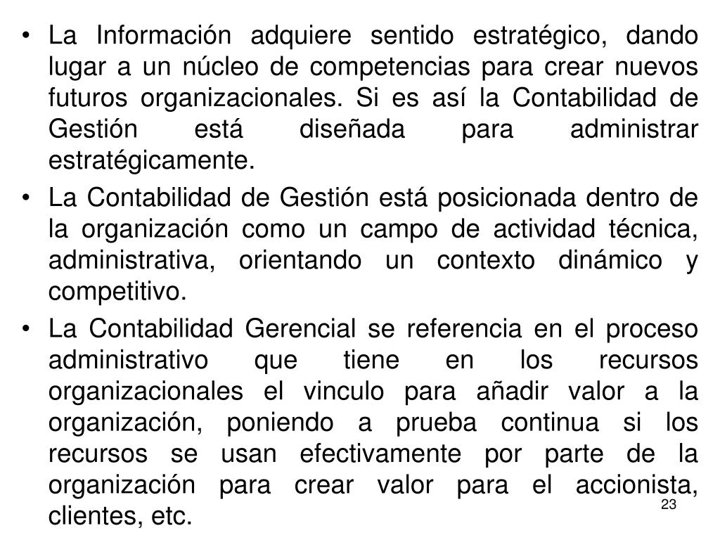 La Información adquiere sentido estratégico, dando lugar a un núcleo de competencias para crear nuevos futuros organizacionales. Si es así la Contabilidad de Gestión está diseñada para administrar estratégicamente. • La Contabilidad de Gestión está posicionada dentro de la organización como un campo de actividad técnica, administrativa, orientando un contexto dinámico y competitivo. • La Contabilidad Gerencial se referencia en el proceso administrativo que tiene en los recursos organizacionales el vinculo para añadir valor a la organización, poniendo a prueba continua si los recursos se usan efectivamente por parte de la organización para crear valor para el accionista, clientes, etc.