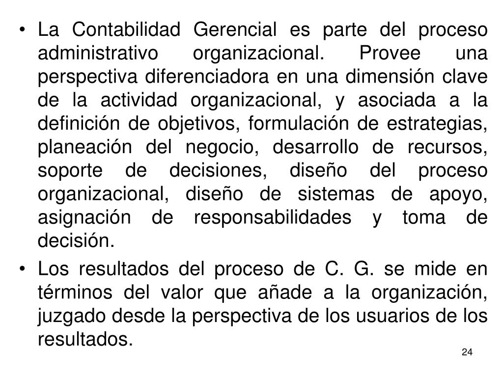 La Contabilidad Gerencial es parte del proceso administrativo organizacional. Provee una perspectiva diferenciadora en una dimensión clave de la actividad organizacional, y asociada a la definición de objetivos, formulación de estrategias, planeación del negocio, desarrollo de recursos, soporte de decisiones, diseño del proceso organizacional, diseño de sistemas de apoyo, asignación de responsabilidades y toma de decisión. • Los resultados del proceso de C. G. se mide en términos del valor que añade a la organización, juzgado desde la perspectiva de los usuarios de los resultados.