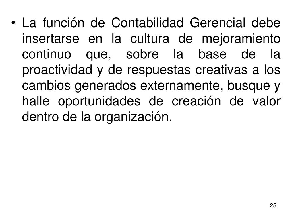 La función de Contabilidad Gerencial debe insertarse en la cultura de mejoramiento continuo que, sobre la base de la proactividad y de respuestas creativas a los cambios generados externamente, busque y halle oportunidades de creación de valor dentro de la organización.