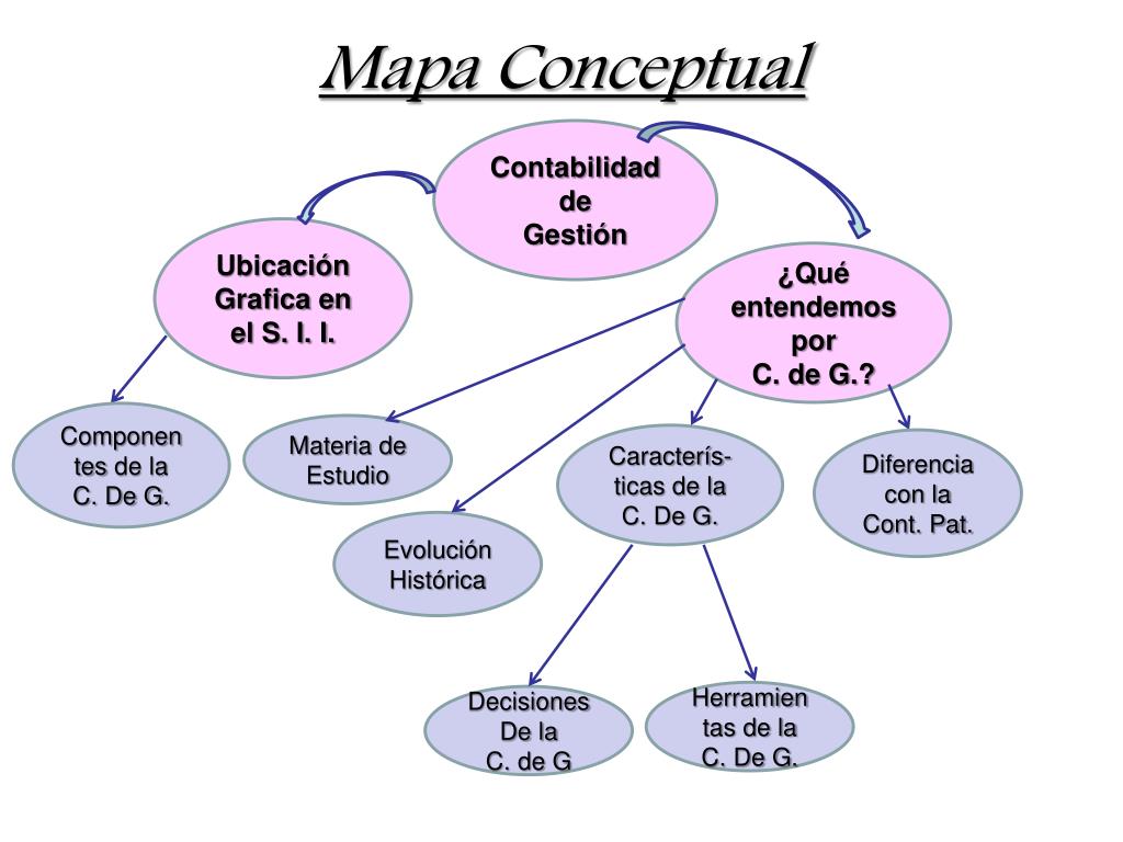 Mapa Conceptual Contabilidad de Gestión Ubicación Grafica en el S. I. I. ¿Qué entendemos por C. de G.? Componen tes de la C. De G. Materia de Estudio Caracterís-ticas de la C. De G. Diferencia con la Cont. Pat. Evolución Histórica Herramien tas de la C. De G. Decisiones De la C. de G