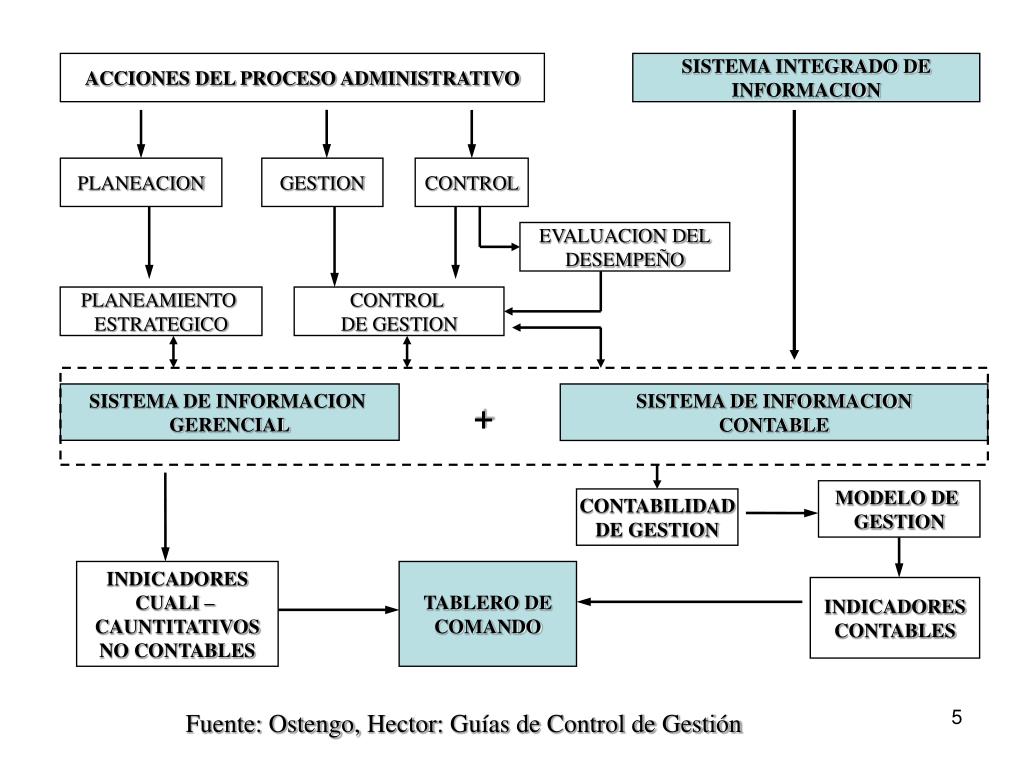 ACCIONES DEL PROCESO ADMINISTRATIVO SISTEMA INTEGRADO DE INFORMACION PLANEACION GESTION CONTROL EVALUACION DEL DESEMPEÑO PLANEAMIENTO ESTRATEGICO CONTROL DE GESTION SISTEMA DE INFORMACION GERENCIAL SISTEMA DE INFORMACION CONTABLE + MODELO DE GESTION CONTABILIDAD DE GESTION INDICADORES CUALI – CAUNTITATIVOS NO CONTABLES TABLERO DE COMANDO INDICADORES CONTABLES Fuente: Ostengo, Hector: Guías de Control de Gestión