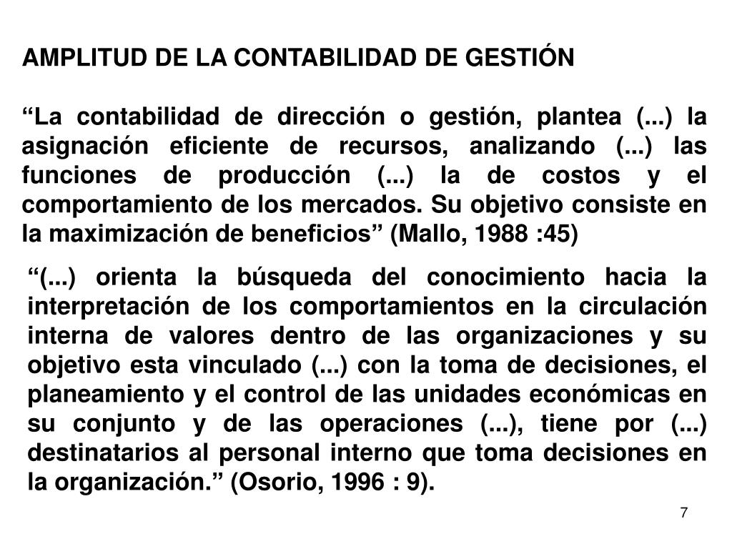 AMPLITUD DE LA CONTABILIDAD DE GESTIÓN “La contabilidad de dirección o gestión, plantea (...) la asignación eficiente de recursos, analizando (...) las funciones de producción (...) la de costos y el comportamiento de los mercados. Su objetivo consiste en la maximización de beneficios” (Mallo, 1988 :45) “(...) orienta la búsqueda del conocimiento hacia la interpretación de los comportamientos en la circulación interna de valores dentro de las organizaciones y su objetivo esta vinculado (...) con la toma de decisiones, el planeamiento y el control de las unidades económicas en su conjunto y de las operaciones (...), tiene por (...) destinatarios al personal interno que toma decisiones en la organización.” (Osorio, 1996 : 9).