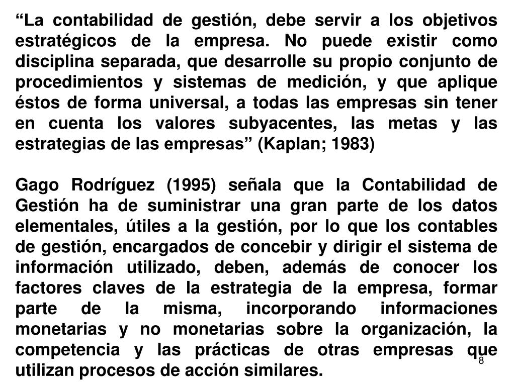 “La contabilidad de gestión, debe servir a los objetivos estratégicos de la empresa. No puede existir como disciplina separada, que desarrolle su propio conjunto de procedimientos y sistemas de medición, y que aplique éstos de forma universal, a todas las empresas sin tener en cuenta los valores subyacentes, las metas y las estrategias de las empresas” (Kaplan; 1983) Gago Rodríguez (1995) señala que la Contabilidad de Gestión ha de suministrar una gran parte de los datos elementales, útiles a la gestión, por lo que los contables de gestión, encargados de concebir y dirigir el sistema de información utilizado, deben, además de conocer los factores claves de la estrategia de la empresa, formar parte de la misma, incorporando informaciones monetarias y no monetarias sobre la organización, la competencia y las prácticas de otras empresas que utilizan procesos de acción similares.