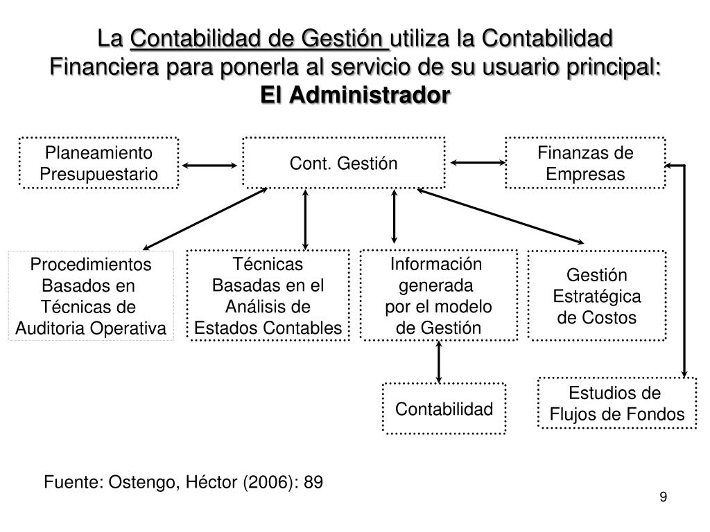 La Contabilidad de Gestión utiliza la Contabilidad Financiera para ponerla al servicio de su usuario principal: El Administrador Planeamiento Presupuestario Cont. Gestión Finanzas de Empresas Información generada por el modelo de Gestión Técnicas Basadas en el Análisis de Estados Contables Procedimientos Basados en Técnicas de Auditoria Operativa Gestión Estratégica de Costos Estudios de Flujos de Fondos Contabilidad Fuente: Ostengo, Héctor (2006): 89