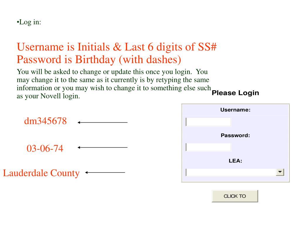 Log in: • Username is Initials & Last 6 digits of SS#Password is Birthday (with dashes) • You will be asked to change or update this once you login. You may change it to the same as it currently is by retyping the same information or you may wish to change it to something else such as your Novell login. dm345678 03-06-74 Lauderdale County