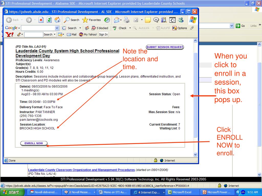 Note the location and time. When you click to enroll in a session, this box pops up. Click ENROLL NOW to enroll.