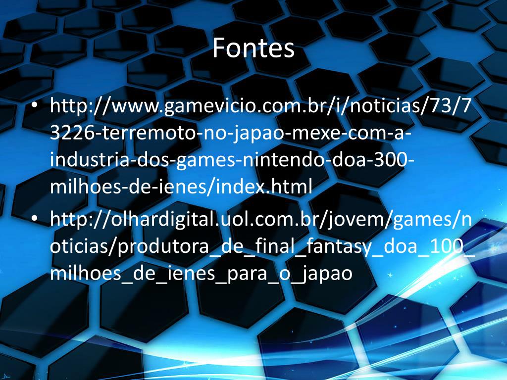 Fontes • http://www.gamevicio.com.br/i/noticias/73/73226-terremoto-no-japao-mexe-com-a-industria-dos-games-nintendo-doa-300-milhoes-de-ienes/index.html • http://olhardigital.uol.com.br/jovem/games/noticias/produtora_de_final_fantasy_doa_100_milhoes_de_ienes_para_o_japao