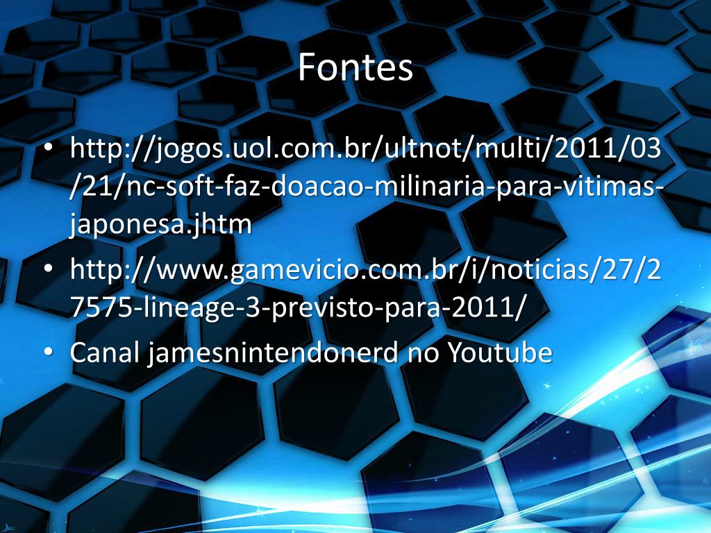Fontes • http://jogos.uol.com.br/ultnot/multi/2011/03/21/nc-soft-faz-doacao-milinaria-para-vitimas-japonesa.jhtm • http://www.gamevicio.com.br/i/noticias/27/27575-lineage-3-previsto-para-2011/ • Canal jamesnintendonerd no Youtube