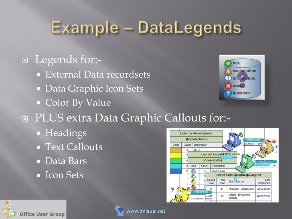 Example – DataLegends • Legends for:- • External Data recordsets • Data Graphic Icon Sets • Color By Value • PLUS extra Data Graphic Callouts for:- • Headings • Text Callouts • Data Bars • Icon Sets