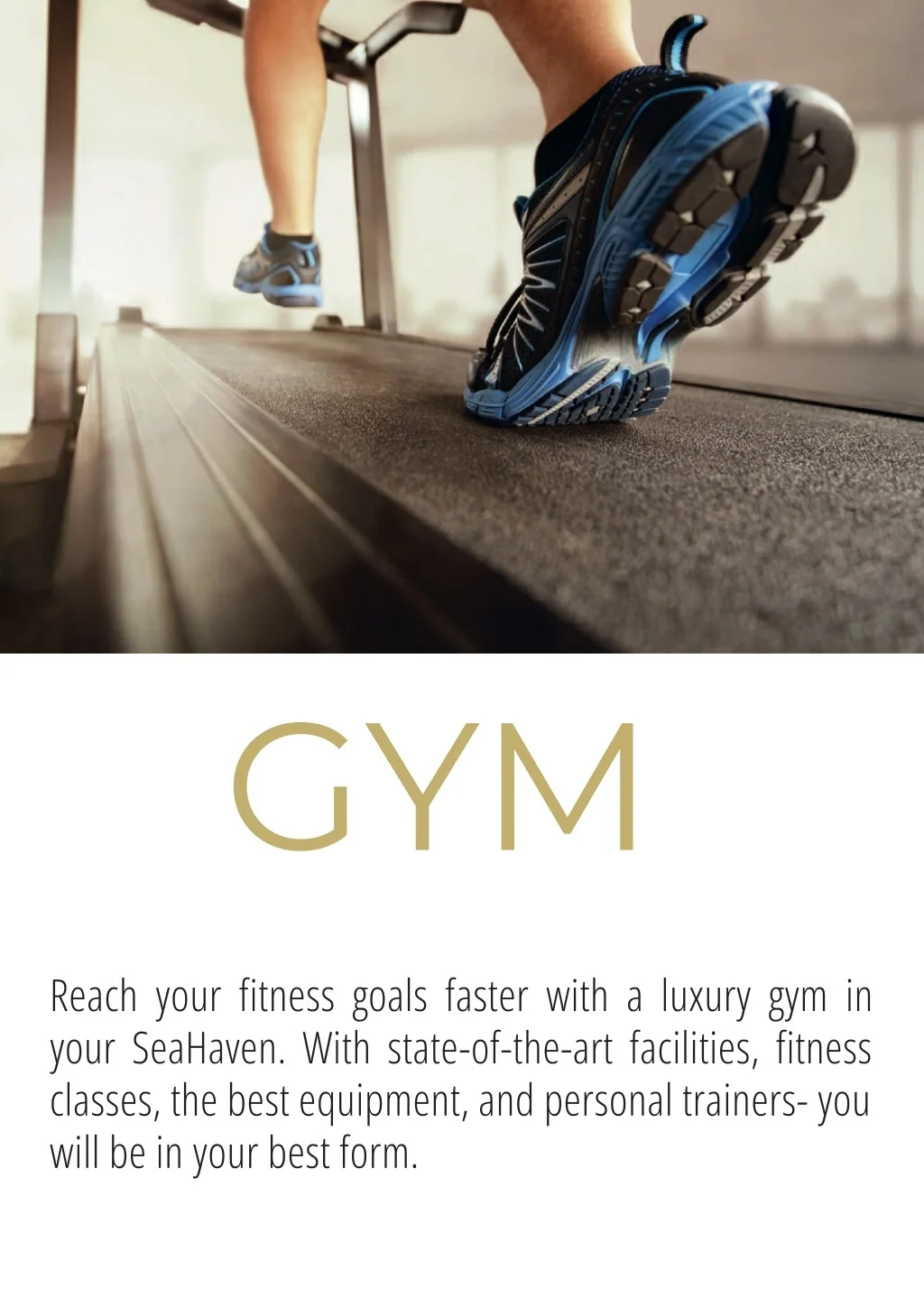 GYM Reach your fitness goals faster with a luxury gym in your SeaHaven. With state-of-the-art facilities, fitness classes, the best equipment, and personal trainers- you will be in your best form.