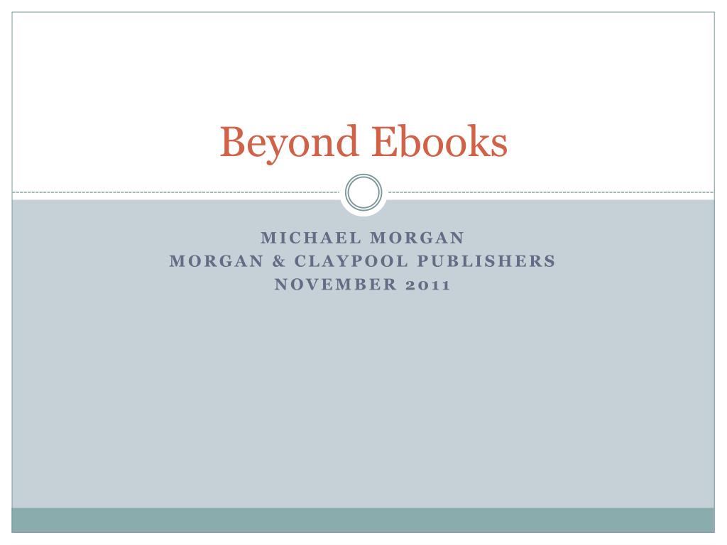 Beyond Ebooks. MICHAEL MORGAN MORGAN & CLAYPOOL PUBLISHERS NOVEMBER 2011. Ebook Growth. Ebook reading is increasing dramatically throughout the world. Ebook sales increased to approximately $2 Billion globally in 2010 and may double for 2011.