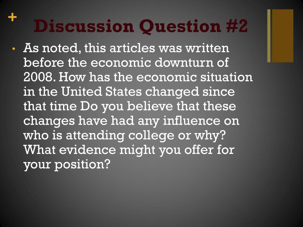 Discussion Question #2 • As noted, this articles was written before the economic downturn of 2008. How has the economic situation in the United States changed since that time Do you believe that these changes have had any influence on who is attending college or why? What evidence might you offer for your position?