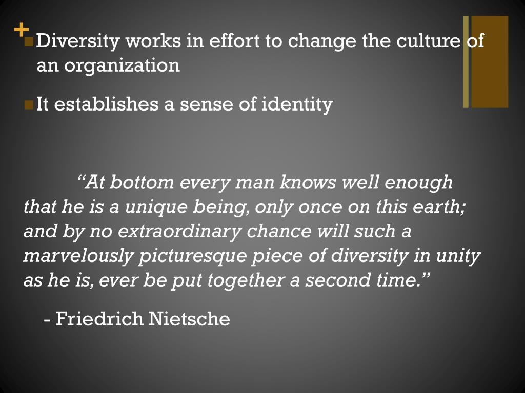 Diversity works in effort to change the culture of an organization • It establishes a sense of identity “At bottom every man knows well enough that he is a unique being, only once on this earth; and by no extraordinary chance will such a marvelously picturesque piece of diversity in unity as he is, ever be put together a second time.” - Friedrich Nietsche