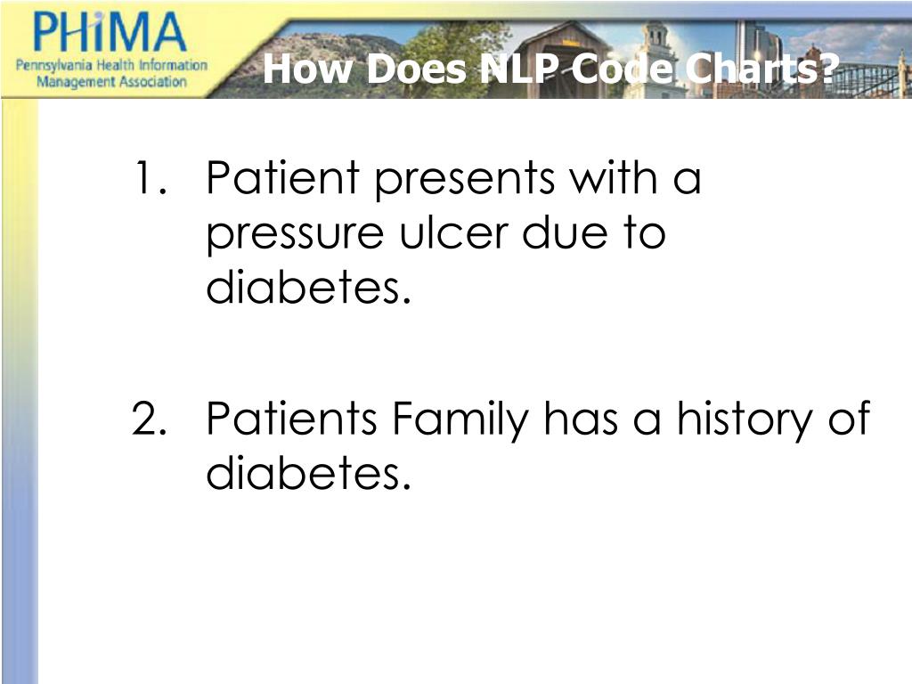 How Does NLP Code Charts? • Patient presents with a pressure ulcer due to diabetes. • Patients Family has a history of diabetes.