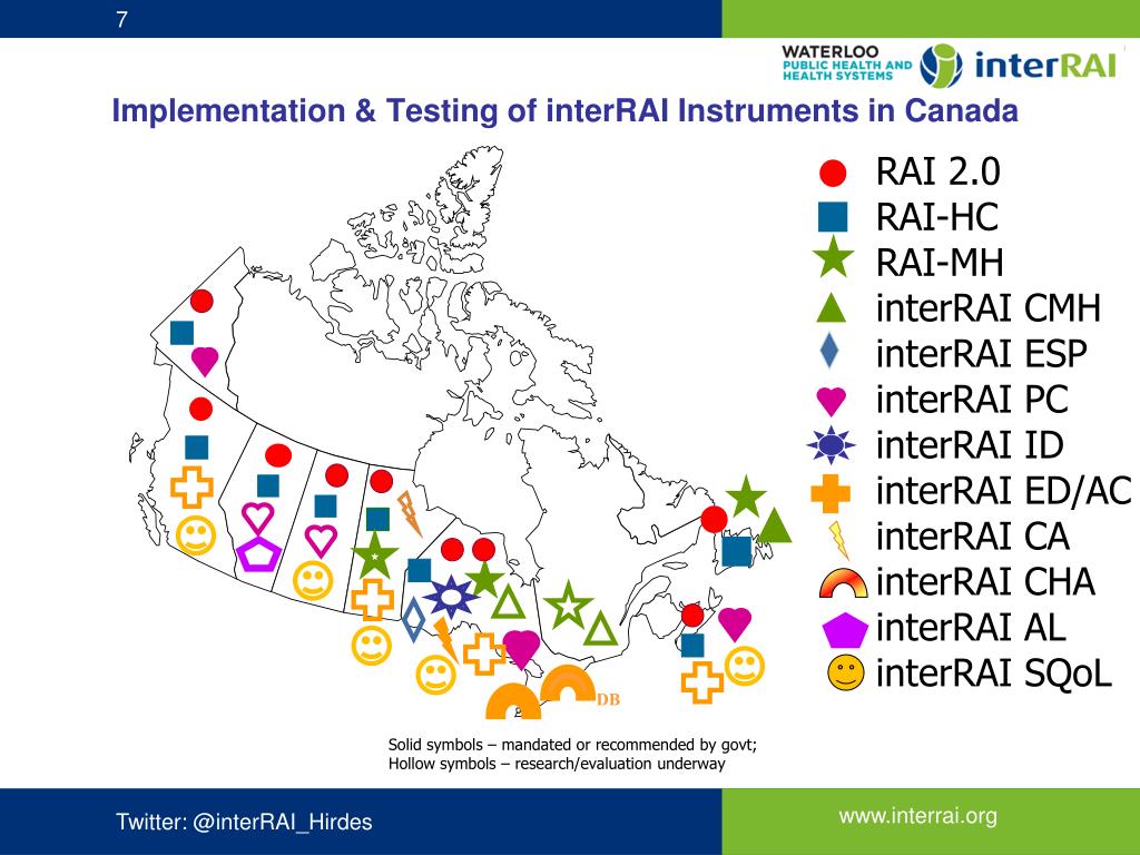 Implementation & Testing of interRAIInstruments in Canada RAI 2.0 RAI-HC RAI-MH interRAI CMH interRAI ESP interRAI PC interRAI ID interRAI ED/AC interRAI CA interRAI CHA interRAI AL interRAI SQoL DB Solid symbols – mandated or recommended by govt; Hollow symbols – research/evaluation underway