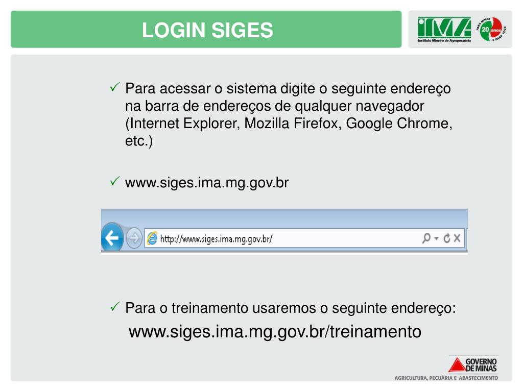 LOGIN SIGES • Para acessar o sistema digite o seguinte endereço na barra de endereços de qualquer navegador (Internet Explorer, Mozilla Firefox, Google Chrome, etc.) • www.siges.ima.mg.gov.br • Para o treinamento usaremos o seguinte endereço: www.siges.ima.mg.gov.br/treinamento