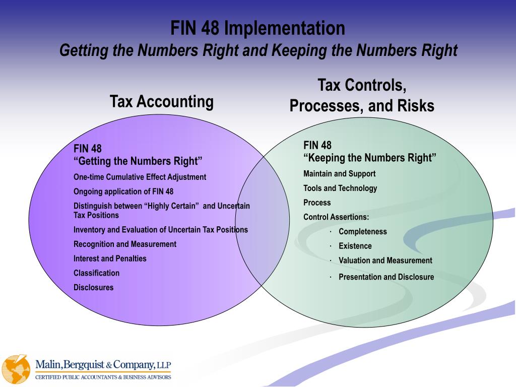 FASB Interpretation No. 48 (FIN 48) Accounting for Uncertainty in Income Taxes an interpretation of FASB Statement No. 109. Presented by Anthony Dodds, CPA, MST Director of SEC/Public Company Audit Services Malin, Bergquist & Company, LLP. FIN 48 Overview / The Basics.