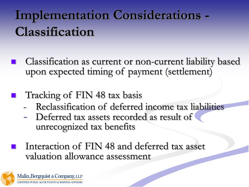 Implementation Considerations - Classification • Classification as current or non-current liability based upon expected timing of payment (settlement) • Tracking of FIN 48 tax basis - Reclassification of deferred income tax liabilities • Deferred tax assets recorded as result of unrecognized tax benefits • Interaction of FIN 48 and deferred tax asset valuation allowance assessment
