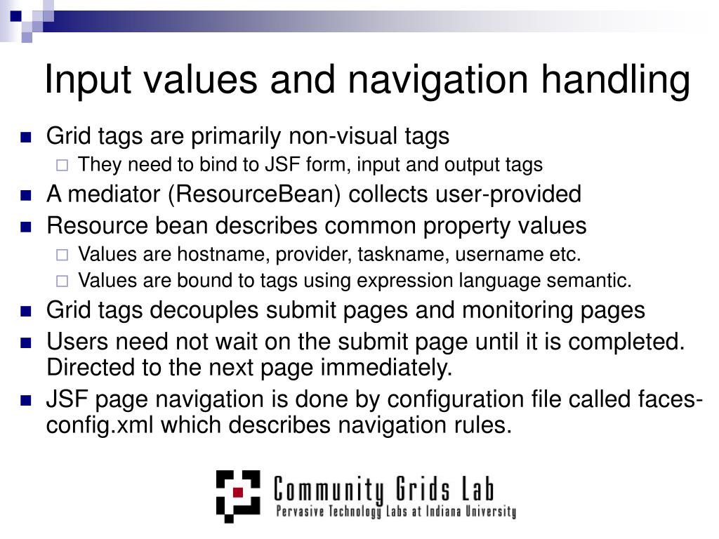 Input values and navigation handling • Grid tags are primarily non-visual tags • They need to bind to JSF form, input and output tags • A mediator (ResourceBean) collects user-provided • Resource bean describes common property values • Values are hostname, provider, taskname, username etc. • Values are bound to tags using expression language semantic. • Grid tags decouples submit pages and monitoring pages • Users need not wait on the submit page until it is completed. Directed to the next page immediately. • JSF page navigation is done by configuration file called faces-config.xml which describes navigation rules.