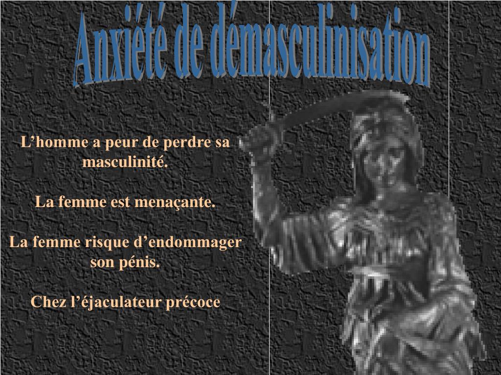 Anxiété de démasculinisation L’homme a peur de perdre sa masculinité. La femme est menaçante. La femme risque d’endommager son pénis. Chez l’éjaculateur précoce