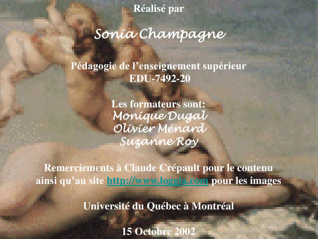 Réalisé par Sonia Champagne Pédagogie de l’enseignement supérieur EDU-7492-20 Les formateurs sont: Monique Dugal Olivier Ménard Suzanne Roy Remerciements à Claude Crépault pour le contenu ainsi qu’au site http://www.loggia.com pour les images Université du Québec à Montréal 15 Octobre 2002
