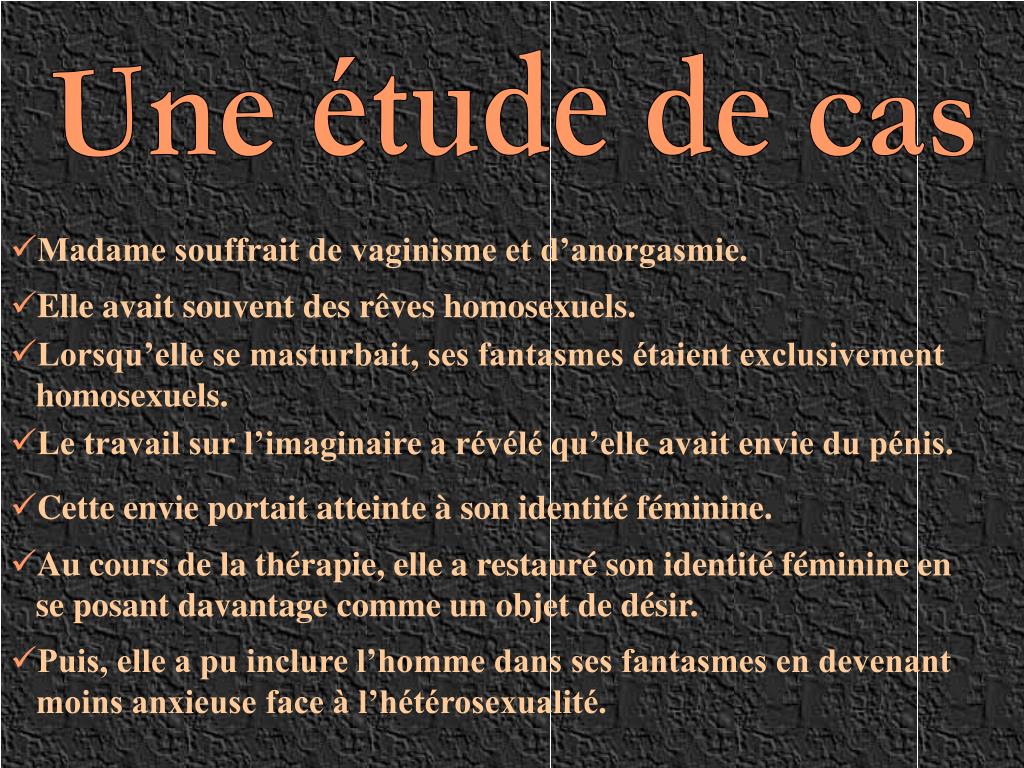 Une étude de cas • Madame souffrait de vaginisme et d’anorgasmie. • Elle avait souvent des rêves homosexuels. • Lorsqu’elle se masturbait, ses fantasmes étaient exclusivement • homosexuels. • Le travail sur l’imaginaire a révélé qu’elle avait envie du pénis. • Cette envie portait atteinte à son identité féminine. • Au cours de la thérapie, elle a restauré son identité féminine en se posant davantage comme un objet de désir. • Puis, elle a pu inclure l’homme dans ses fantasmes en devenant • moins anxieuse face à l’hétérosexualité.