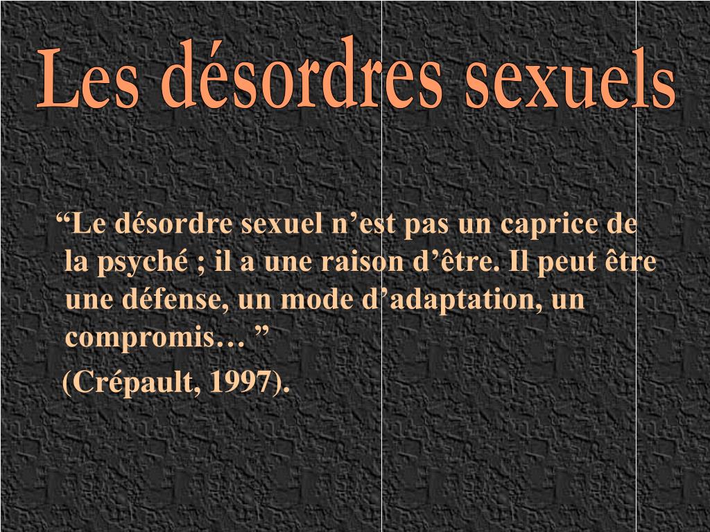 Les désordres sexuels “Le désordre sexuel n’est pas un caprice de la psyché ; il a une raison d’être. Il peut être une défense, un mode d’adaptation, un compromis… ” (Crépault, 1997).