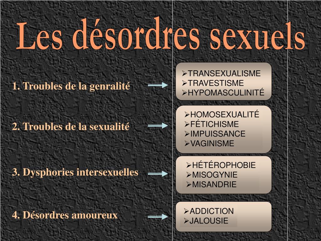 TRANSEXUALISME • TRAVESTISME • HYPOMASCULINITÉ 1. Troubles de la genralité • HOMOSEXUALITÉ • FÉTICHISME • IMPUISSANCE • VAGINISME 2. Troubles de la sexualité • HÉTÉROPHOBIE • MISOGYNIE • MISANDRIE 3. Dysphories intersexuelles • ADDICTION • JALOUSIE 4. Désordres amoureux Les désordres sexuels