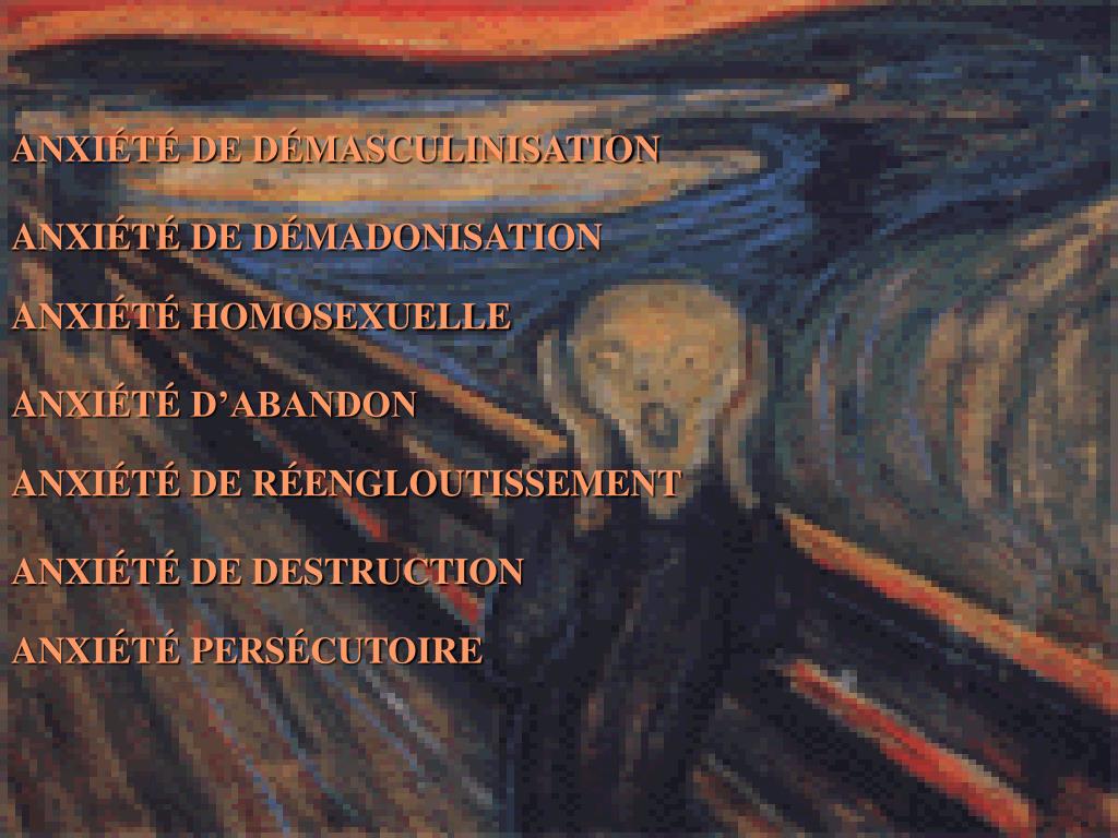 ANXIÉTÉ DE DÉMASCULINISATION ANXIÉTÉDE DÉMADONISATION ANXIÉTÉHOMOSEXUELLE ANXIÉTÉD’ABANDON ANXIÉTÉDE RÉENGLOUTISSEMENT ANXIÉTÉDE DESTRUCTION ANXIÉTÉPERSÉCUTOIRE