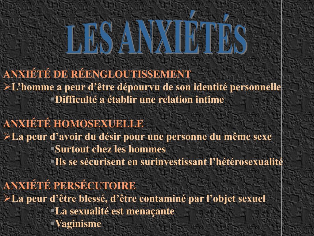 LES ANXIÉTÉS • ANXIÉTÉ DE RÉENGLOUTISSEMENT • L’homme a peur d’être dépourvu de son identité personnelle • Difficulté a établir une relation intime • ANXIÉTÉ HOMOSEXUELLE • La peur d’avoir du désir pour une personne du même sexe • Surtout chez les hommes • Ils se sécurisent en surinvestissant l’hétérosexualité • ANXIÉTÉ PERSÉCUTOIRE • La peur d’être blessé, d’être contaminé par l’objet sexuel • La sexualité est menaçante • Vaginisme