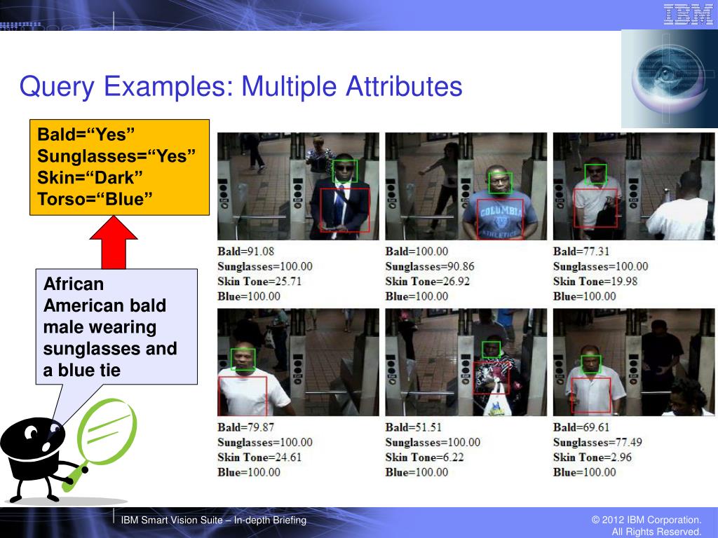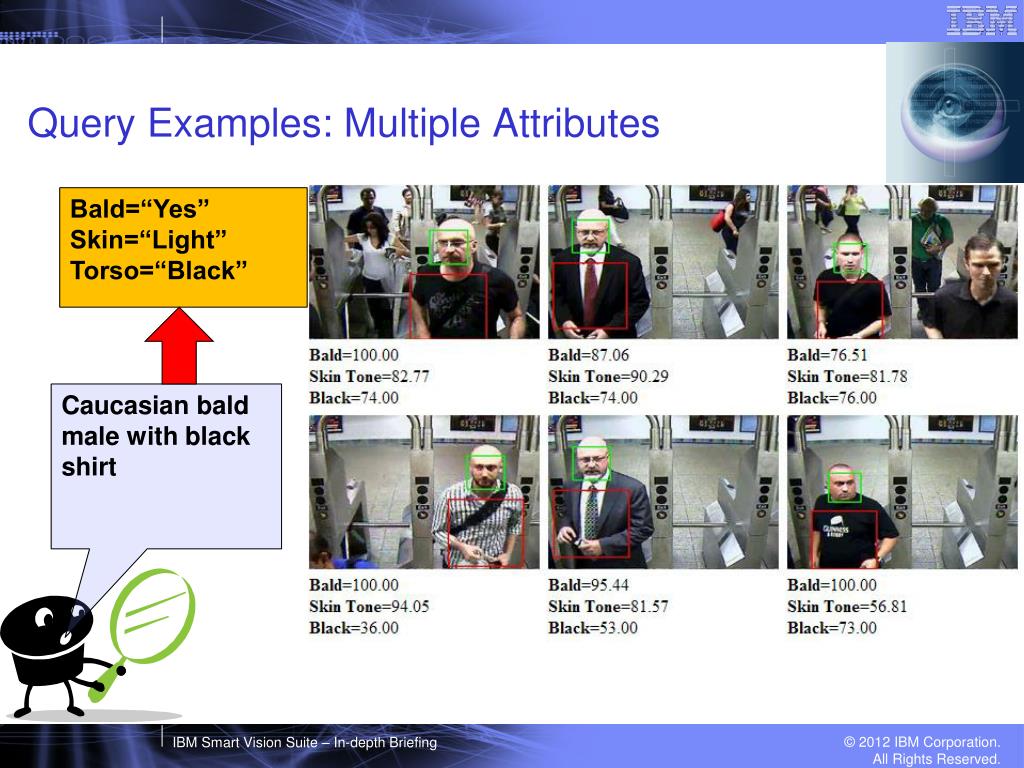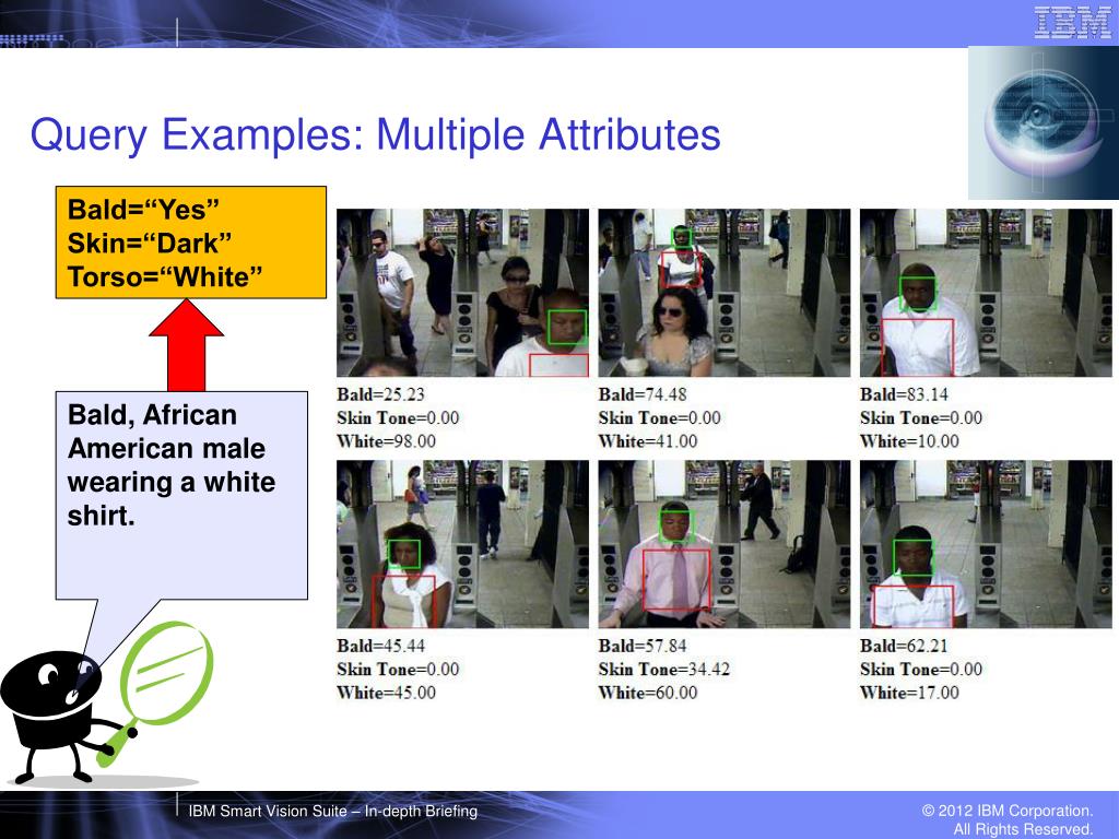 Query Examples: Multiple Attributes Bald=“Yes” Skin=“Dark” Torso=“White” Bald, African American male wearing a white shirt.