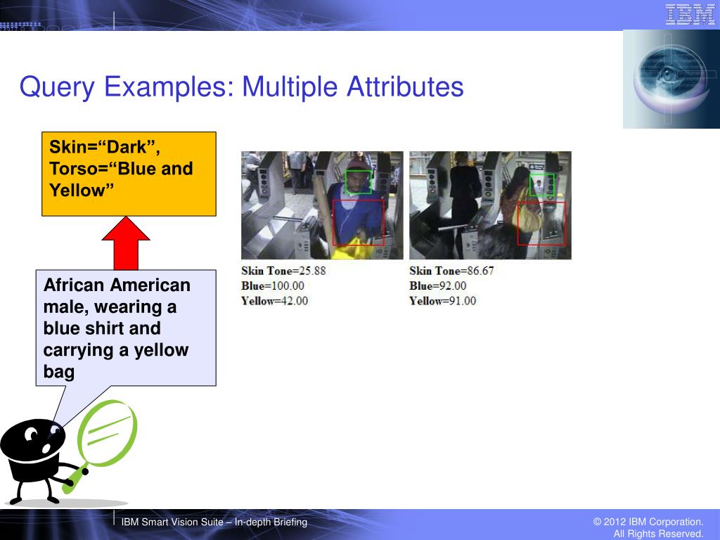 Query Examples: Multiple Attributes Skin=“Dark”, Torso=“Blue and Yellow” African American male, wearing a blue shirt and carrying a yellow bag