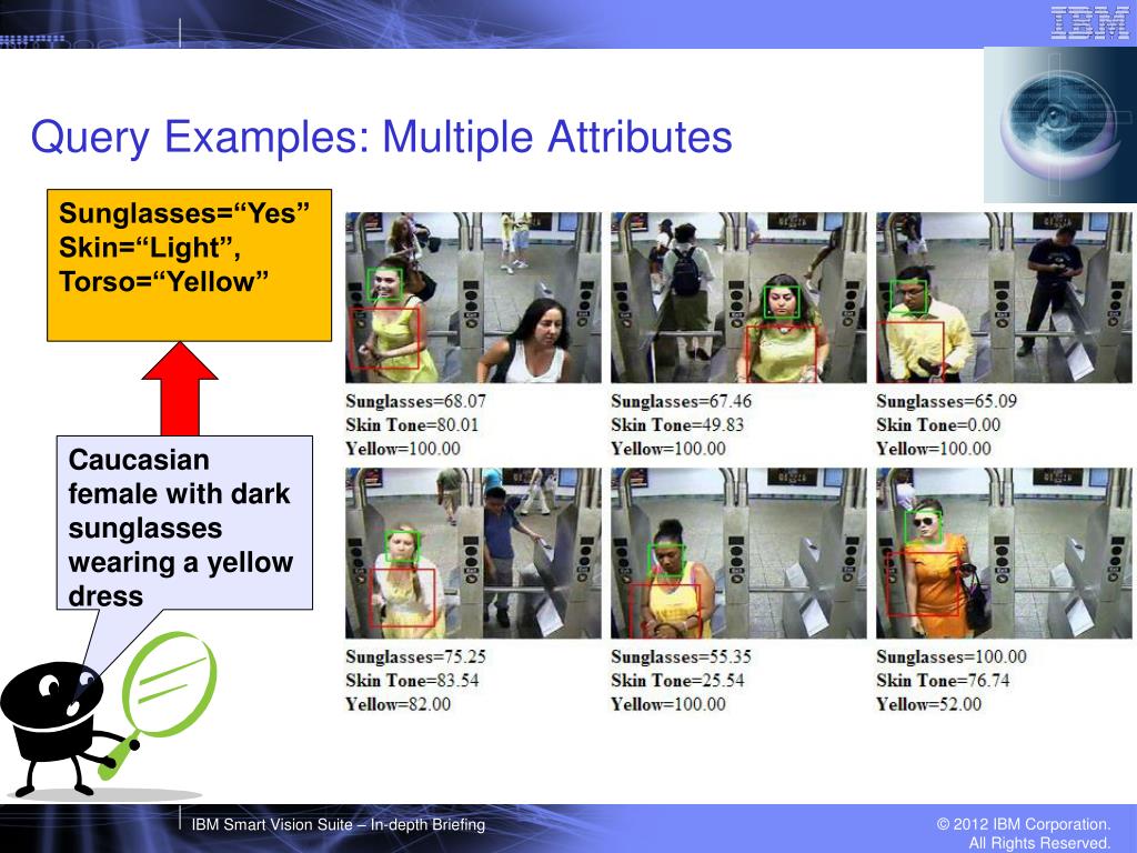Query Examples: Multiple Attributes Sunglasses=“Yes” Skin=“Light”, Torso=“Yellow” Caucasian female with dark sunglasses wearing a yellow dress