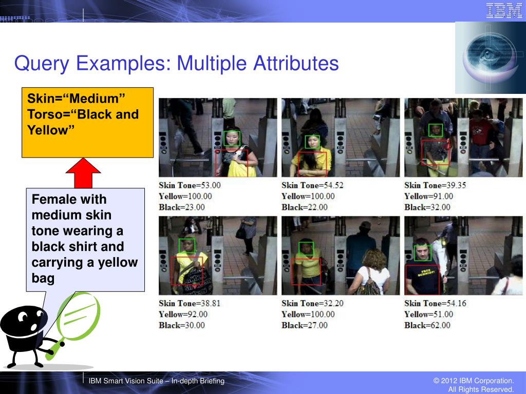 Query Examples: Multiple Attributes Skin=“Medium” Torso=“Black and Yellow” Female with medium skin tone wearing a black shirt and carrying a yellow bag