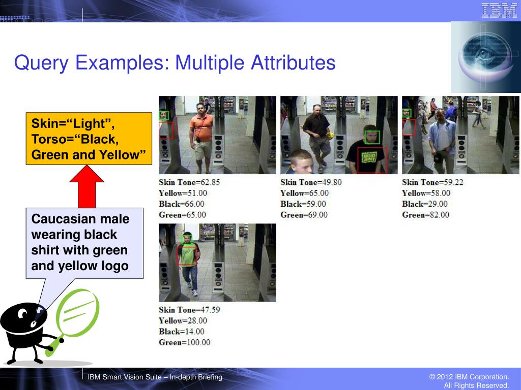 Query Examples: Multiple Attributes Skin=“Light”, Torso=“Black, Green and Yellow” Caucasian male wearing black shirt with green and yellow logo
