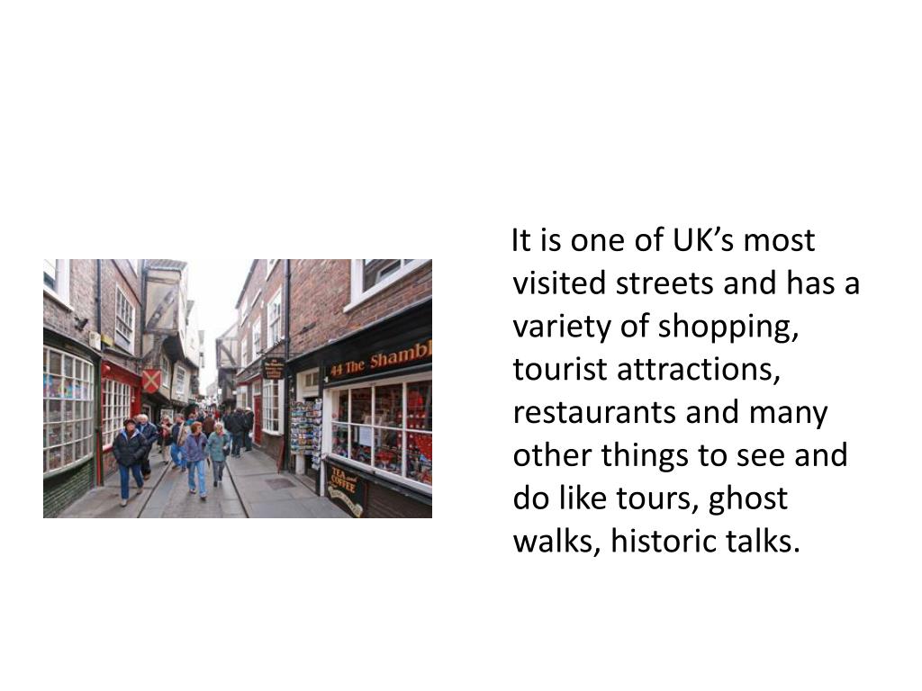 It is one of UK’s most visited streets and has a variety of shopping, tourist attractions, restaurants and many other things to see and do like tours, ghost walks, historic talks.