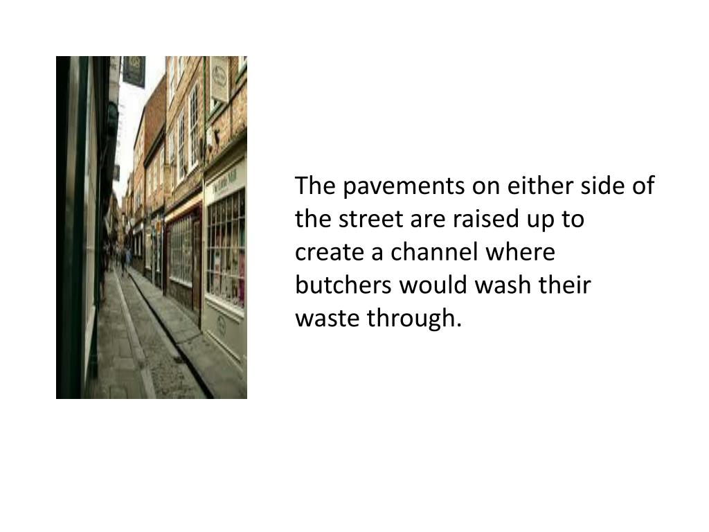 The pavements on either side of the street are raised up to create a channel where butchers would wash their waste through.