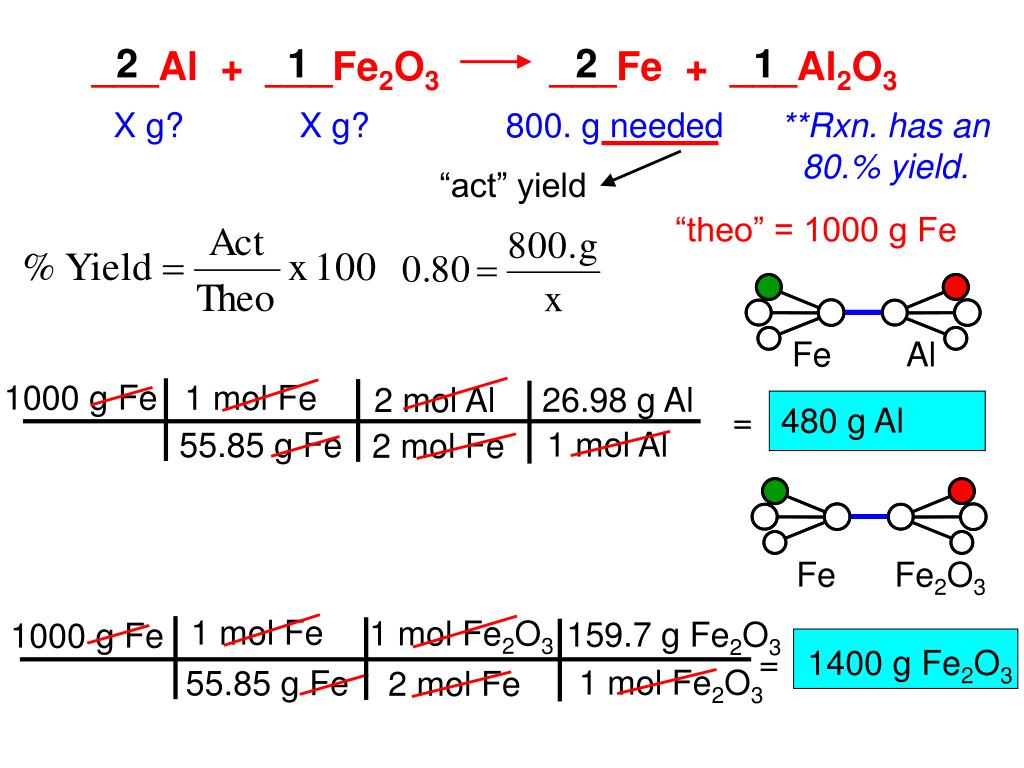 2 1 2 1 ___Al + ___Fe2O3___Fe + ___Al2O3 X g? X g? 800. g needed **Rxn. has an 80.% yield. “act” yield “theo” = 1000 g Fe Fe Al 1000 g Fe 1 mol Fe 26.98 g Al 2 mol Al = 480 g Al 1 mol Al 55.85 g Fe 2 mol Fe Fe Fe2O3 1 mol Fe 1 mol Fe2O3 159.7 g Fe2O3 1000 g Fe = 1400 g Fe2O3 1 mol Fe2O3 55.85 g Fe 2 mol Fe