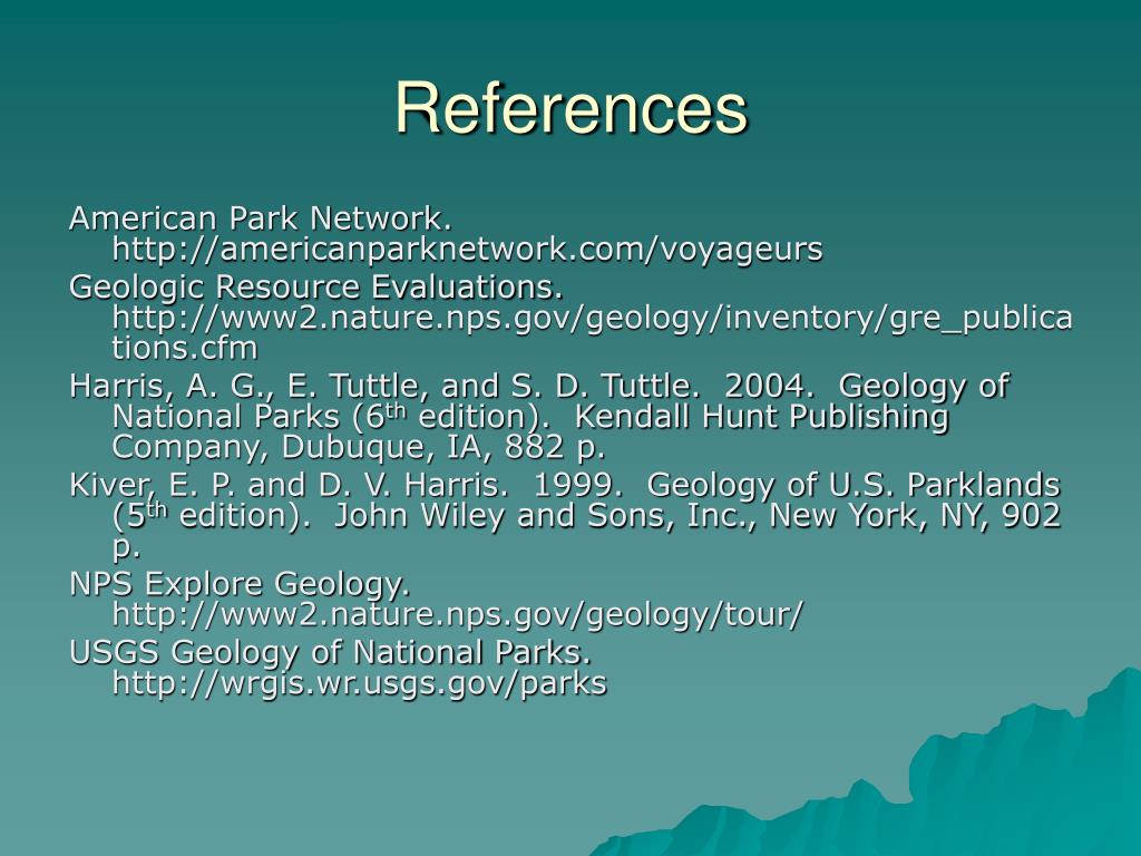 References American Park Network. http://americanparknetwork.com/voyageurs Geologic Resource Evaluations. http://www2.nature.nps.gov/geology/inventory/gre_publications.cfm Harris, A. G., E. Tuttle, and S. D. Tuttle. 2004. Geology of National Parks (6th edition). Kendall Hunt Publishing Company, Dubuque, IA, 882 p. Kiver, E. P. and D. V. Harris. 1999. Geology of U.S. Parklands (5th edition). John Wiley and Sons, Inc., New York, NY, 902 p. NPS Explore Geology. http://www2.nature.nps.gov/geology/tour/ USGS Geology of National Parks. http://wrgis.wr.usgs.gov/parks