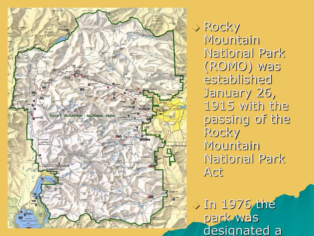 Rocky Mountain National Park (ROMO) was established January 26, 1915 with the passing of the Rocky Mountain National Park Act • In 1976 the park was designated a biosphere reserve